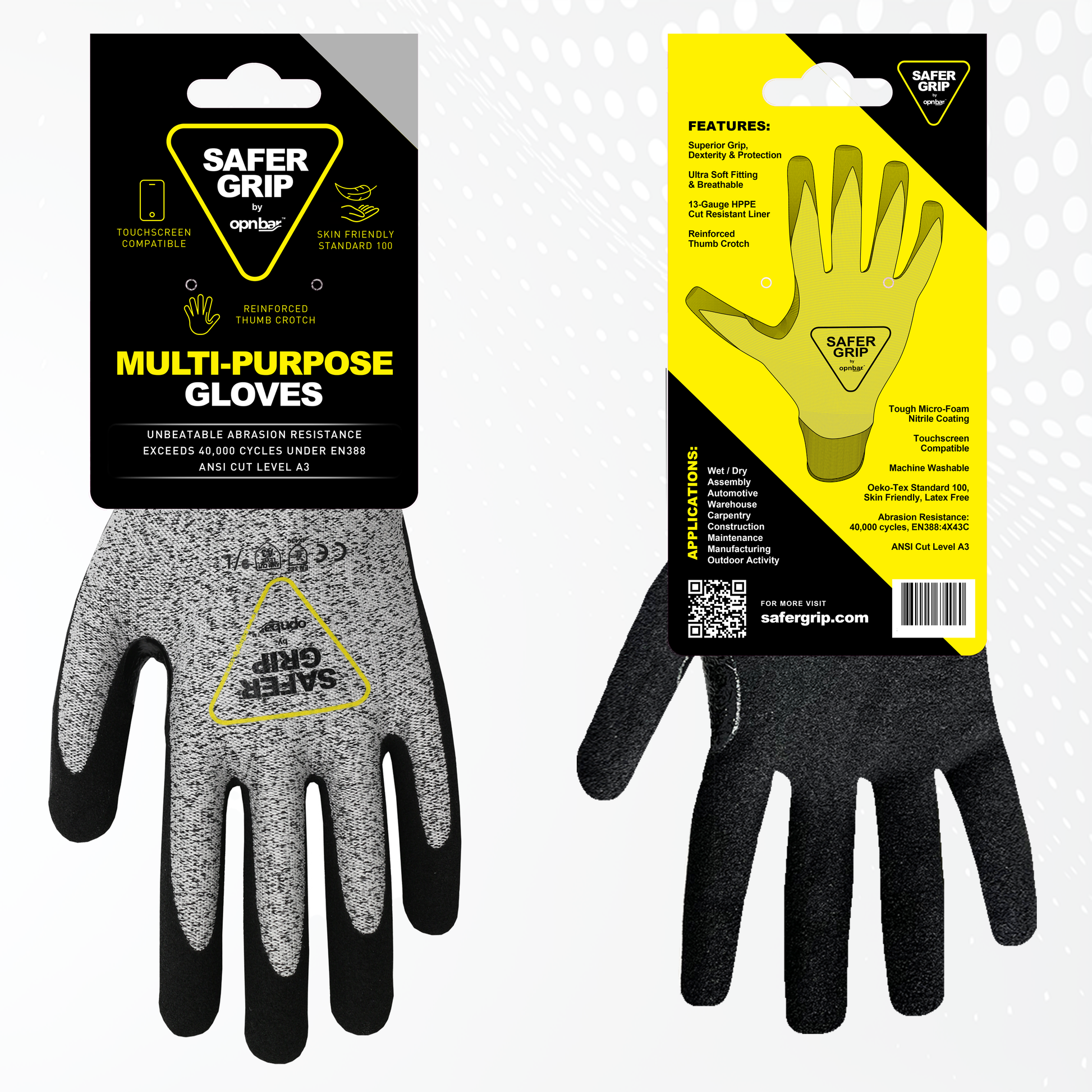 Safer Grip by OPNBar Multi-Purpose work gloves are dipped in our special longer lasting formula, with a durable coating that improves tactility and dexterity. The foam coating resists cuts, abrasions, and tears, and is also a good alternative for people with latex allergies or want an alternative to leather. Our gloves are dipped in an improved nitrile microfoam formula in a three-quarter palm dip. Micro-foam technology offers great breathability, making them cool and comfortable to wear, in any environment. Safer Grip gloves are made of 15-Gauge nylon polyester engineered yarn. The glove conforms to the operator’s hand and offers maximum flexibility and comfort. Our spandex nylon glove palms are coated in micro-foam nitrile, and are quite flexible, making Safer Grip gloves the perfect nitrile foam gloves for working with tools and protecting your hands and products. Our latest glove offers a durable thumb crotch for extra grip and protection. Coated foam gloves are extremely popular, primarily because they have a good price point. They are effective and comfortable, provide great dexterity, and protect operator hands from hazards, as well as protect products from workers’ hands. Foam coatings can be applied and used in wet, oily, cold, and normal situations. Our spandex gloves with a long lasting microfoam nitrile coating are breathable with a coarse surface that can suck up oil and liquid, and maintain grip and tactility even when wet.