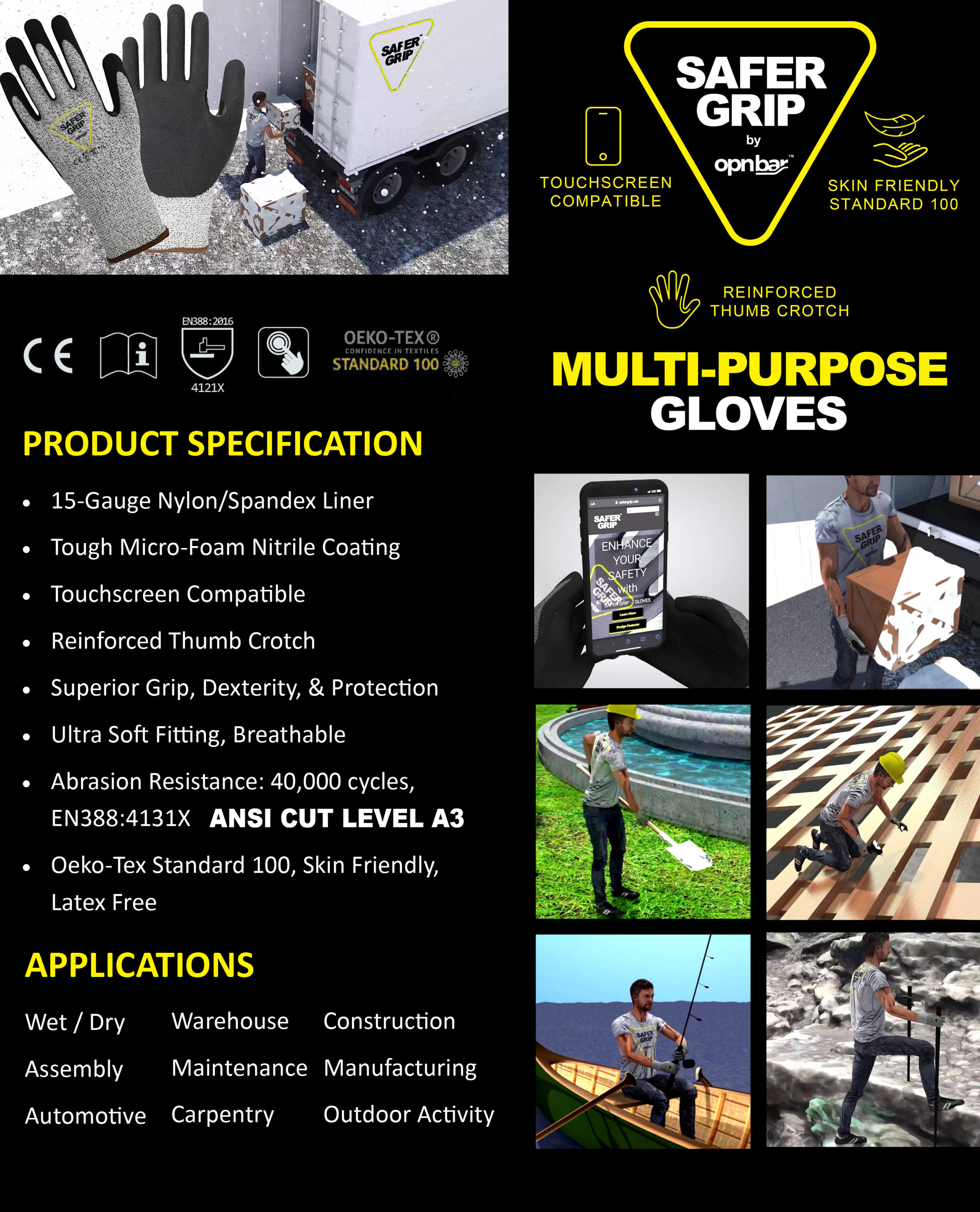 Safer Grip by OPNBar Multi-Purpose work gloves are dipped in our special longer lasting formula, with a durable coating that improves tactility and dexterity. The foam coating resists cuts, abrasions, and tears, and is also a good alternative for people with latex allergies or want an alternative to leather. Our gloves are dipped in an improved nitrile microfoam formula in a three-quarter palm dip. Micro-foam technology offers great breathability, making them cool and comfortable to wear, in any environment. Safer Grip gloves are made of 15-Gauge nylon polyester engineered yarn. The glove conforms to the operator’s hand and offers maximum flexibility and comfort. Our spandex nylon glove palms are coated in micro-foam nitrile, and are quite flexible, making Safer Grip gloves the perfect nitrile foam gloves for working with tools and protecting your hands and products. Our latest glove offers a durable thumb crotch for extra grip and protection. Coated foam gloves are extremely popular, primarily because they have a good price point. They are effective and comfortable, provide great dexterity, and protect operator hands from hazards, as well as protect products from workers’ hands. Foam coatings can be applied and used in wet, oily, cold, and normal situations. Our spandex gloves with a long lasting microfoam nitrile coating are breathable with a coarse surface that can suck up oil and liquid, and maintain grip and tactility even when wet.