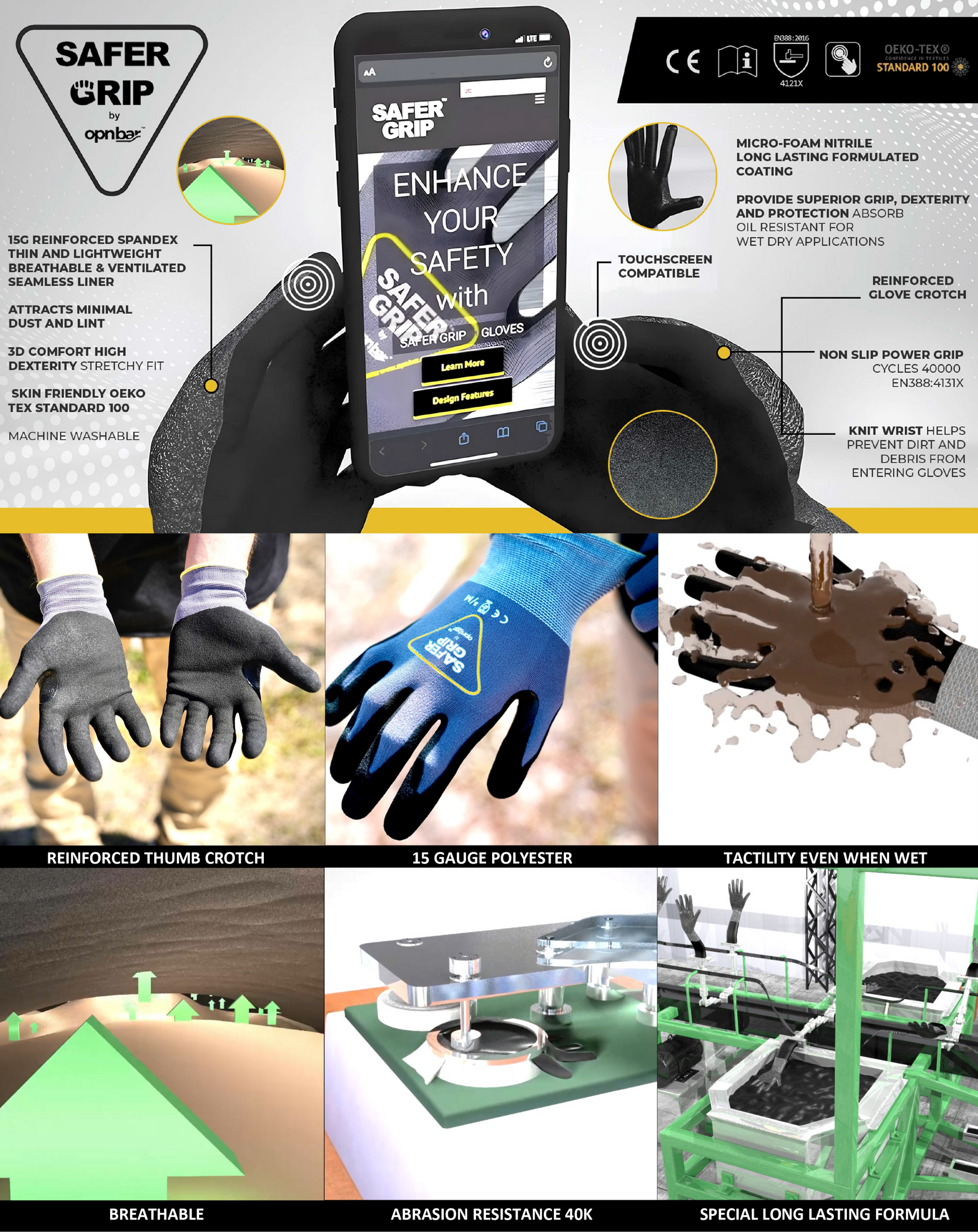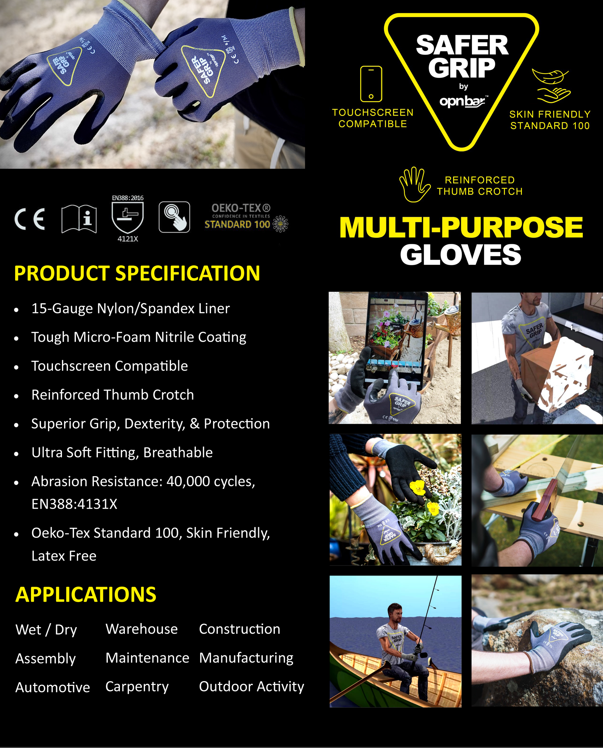 Safer Grip by OPNBar Multi-Purpose work gloves are dipped in our special longer lasting formula, with a durable coating that improves tactility and dexterity. The foam coating resists cuts, abrasions, and tears, and is also a good alternative for people with latex allergies or want an alternative to leather. Our gloves are dipped in an improved nitrile microfoam formula in a three-quarter palm dip. Micro-foam technology offers great breathability, making them cool and comfortable to wear, in any environment. Safer Grip gloves are made of 15-Gauge nylon polyester engineered yarn. The glove conforms to the operator’s hand and offers maximum flexibility and comfort. Our spandex nylon glove palms are coated in micro-foam nitrile, and are quite flexible, making Safer Grip gloves the perfect nitrile foam gloves for working with tools and protecting your hands and products. Our latest glove offers a durable thumb crotch for extra grip and protection. Coated foam gloves are extremely popular, primarily because they have a good price point. They are effective and comfortable, provide great dexterity, and protect operator hands from hazards, as well as protect products from workers’ hands. Foam coatings can be applied and used in wet, oily, cold, and normal situations. Our spandex gloves with a long lasting microfoam nitrile coating are breathable with a coarse surface that can suck up oil and liquid, and maintain grip and tactility even when wet.