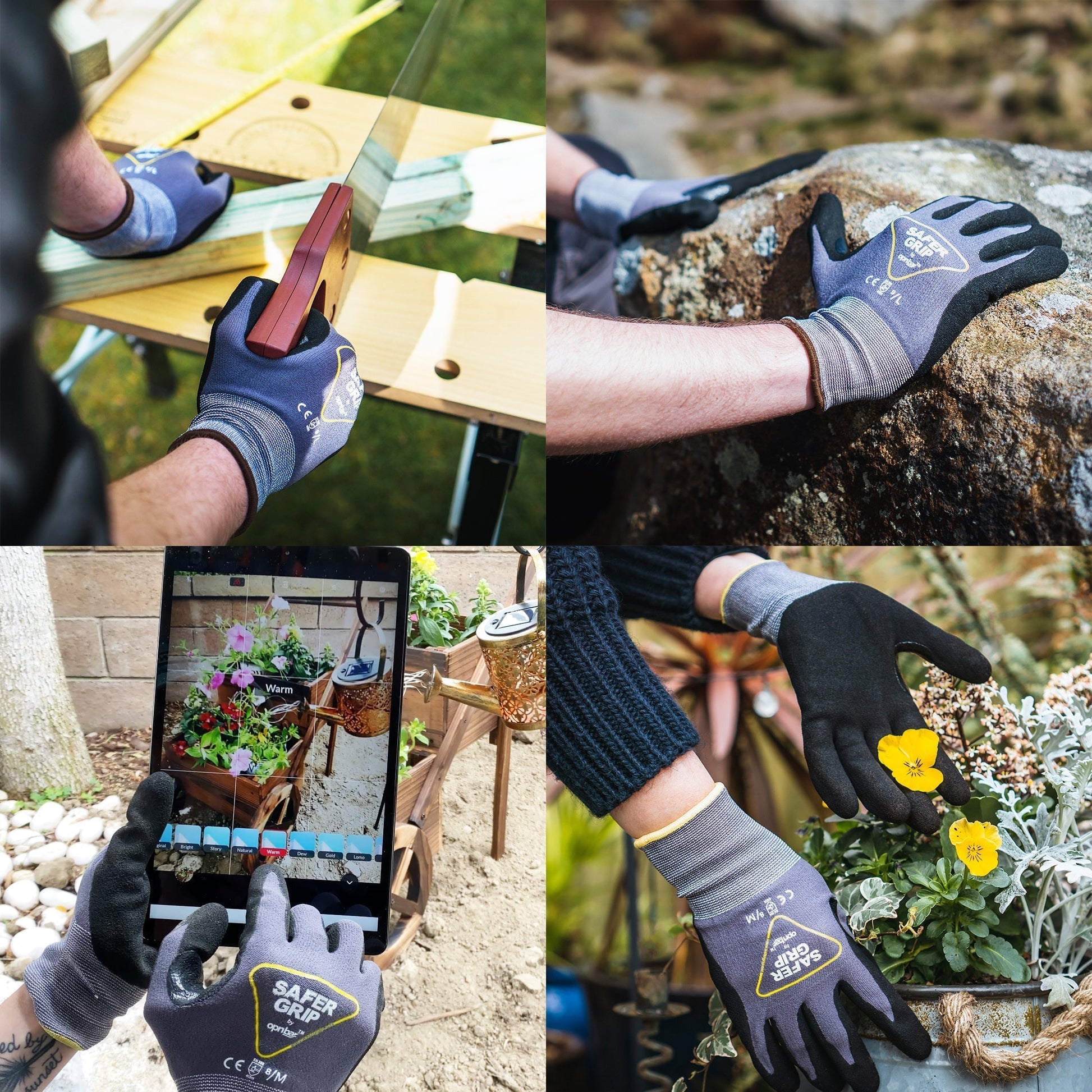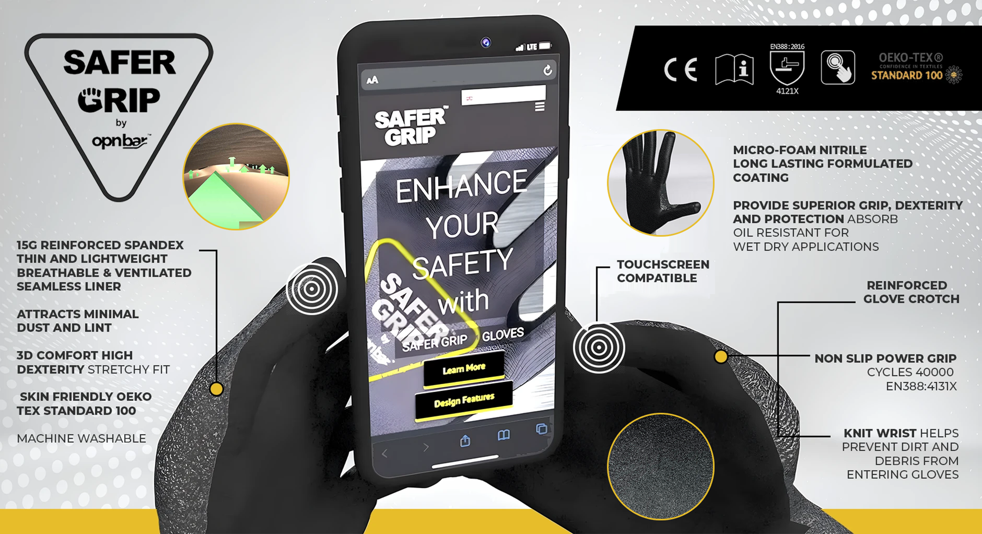 Safer Grip by OPNBar Multi-Purpose work gloves are dipped in our special longer lasting formula, with a durable coating that improves tactility and dexterity. The foam coating resists cuts, abrasions, and tears, and is also a good alternative for people with latex allergies or want an alternative to leather. Our gloves are dipped in an improved nitrile microfoam formula in a three-quarter palm dip. Micro-foam technology offers great breathability, making them cool and comfortable to wear, in any environment. Safer Grip gloves are made of 15-Gauge nylon polyester engineered yarn. The glove conforms to the operator’s hand and offers maximum flexibility and comfort. Our spandex nylon glove palms are coated in micro-foam nitrile, and are quite flexible, making Safer Grip gloves the perfect nitrile foam gloves for working with tools and protecting your hands and products. Our latest glove offers a durable thumb crotch for extra grip and protection. Coated foam gloves are extremely popular, primarily because they have a good price point. They are effective and comfortable, provide great dexterity, and protect operator hands from hazards, as well as protect products from workers’ hands. Foam coatings can be applied and used in wet, oily, cold, and normal situations. Our spandex gloves with a long lasting microfoam nitrile coating are breathable with a coarse surface that can suck up oil and liquid, and maintain grip and tactility even when wet.