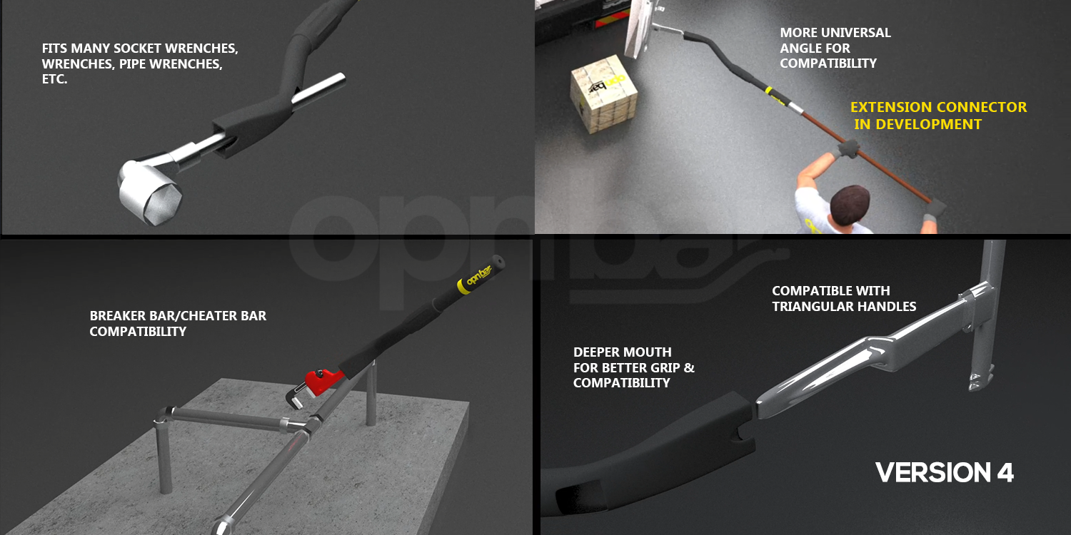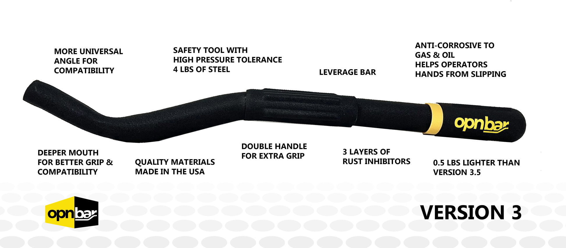 OPNBar version 4 Leverage Bar has a double ergonomic grip, deeper mouth, Breaker Bar/Cheater Bar/Torque Bar, with an upcoming extended handle for more clearance (& optional 5th Wheel Release and extensions). It is also compatible with triangular container levers.